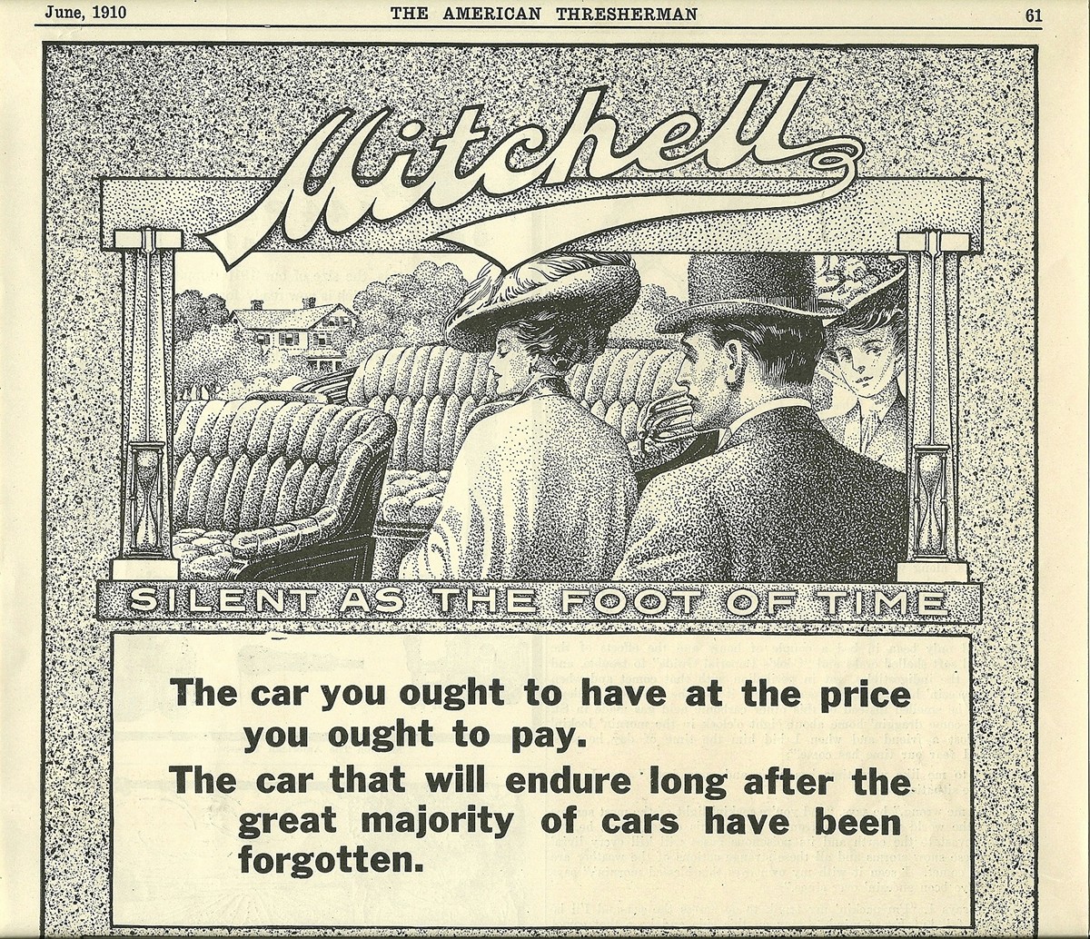 The Mitchell Car needed a slogan and in 1905, the well known slogan was born: “The Car You Ought To Have At The Price You Ought To Pay.” The company continued to expand, producing 315 vehicles, including bigger trucks. A 9 horsepower model car was one of the most popular models, selling for $750 dollars.