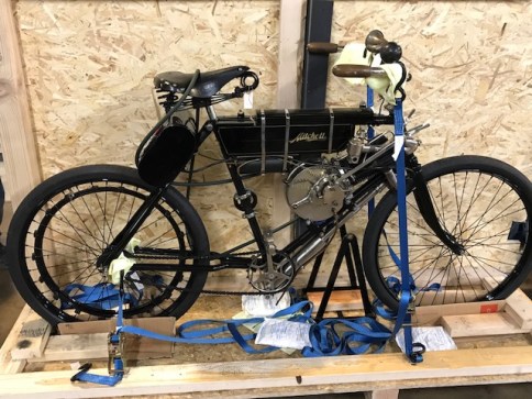 In February of 2018 we welcomed our “unicorn” — a 1902 Mitchell motorbike that we had never expected to find. It’s only the fourth motorcycle known to exist, and it was found near Oxford, England, about 30 years ago by a collector in The Netherlands named Johan Beenan. He parted with it reluctantly in order to help me fill in the missing piece in my Mitchell collection.