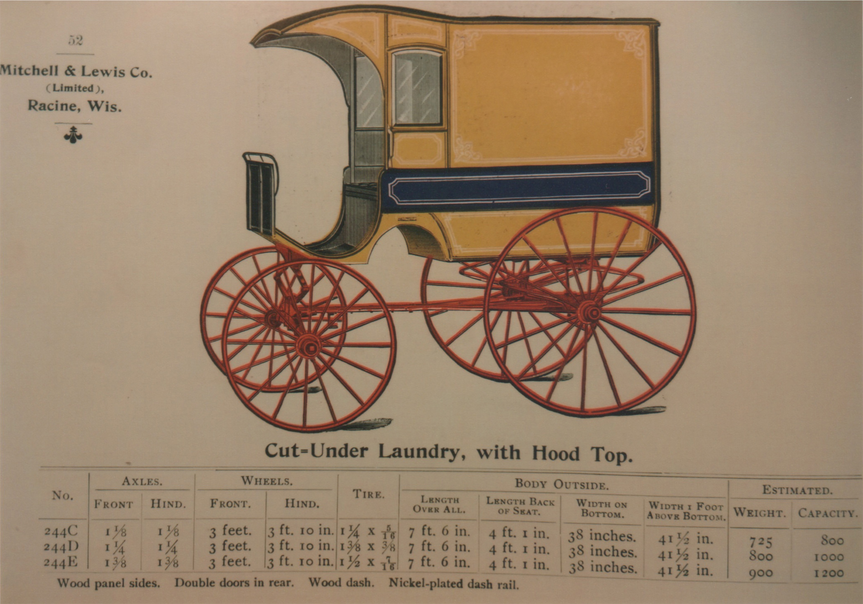 The Urban Wagons would have been used when Henry Mitchell first began in Chicago, and probably shipped there later in his career when The Mitchell Wagon Company became even more successful. “Milk Wagons,” “Laundry Wagons,” and “Funeral Wagons” are just some of the Urban Wagon styles, which also included very large wagons for hauling beer or pianos. Some were built so elaborately that they were enclosed with sides, a roof, and even etched glass windows!